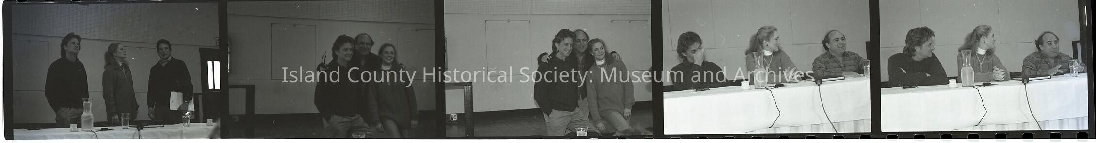 Negative strip of 5 frames of the cast and crew who filmed "War of the Roses". Included are: Michael Douglas, Kathleen Turner, Danny DeVito. These frames are from a press meeting.
