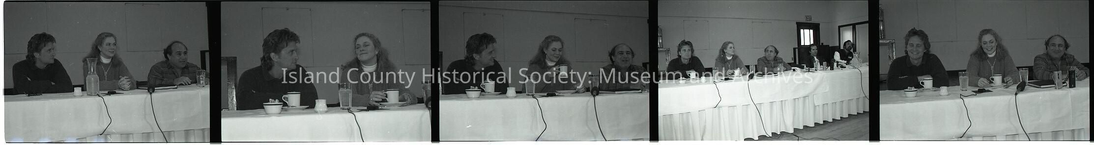 Negative strip of 5 frames of the cast and crew who filmed "War of the Roses". Included are: Michael Douglas, Kathleen Turner, Danny DeVito. These frames are from a press meeting.