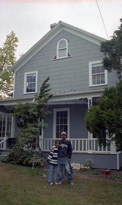 Construction work on old house. Man hugging girl to his side. Paint on jeans. Blue house - wider angle view of the front of the house than in 2016.133.311. The Alvah and Mary Blowers house on North Main St.