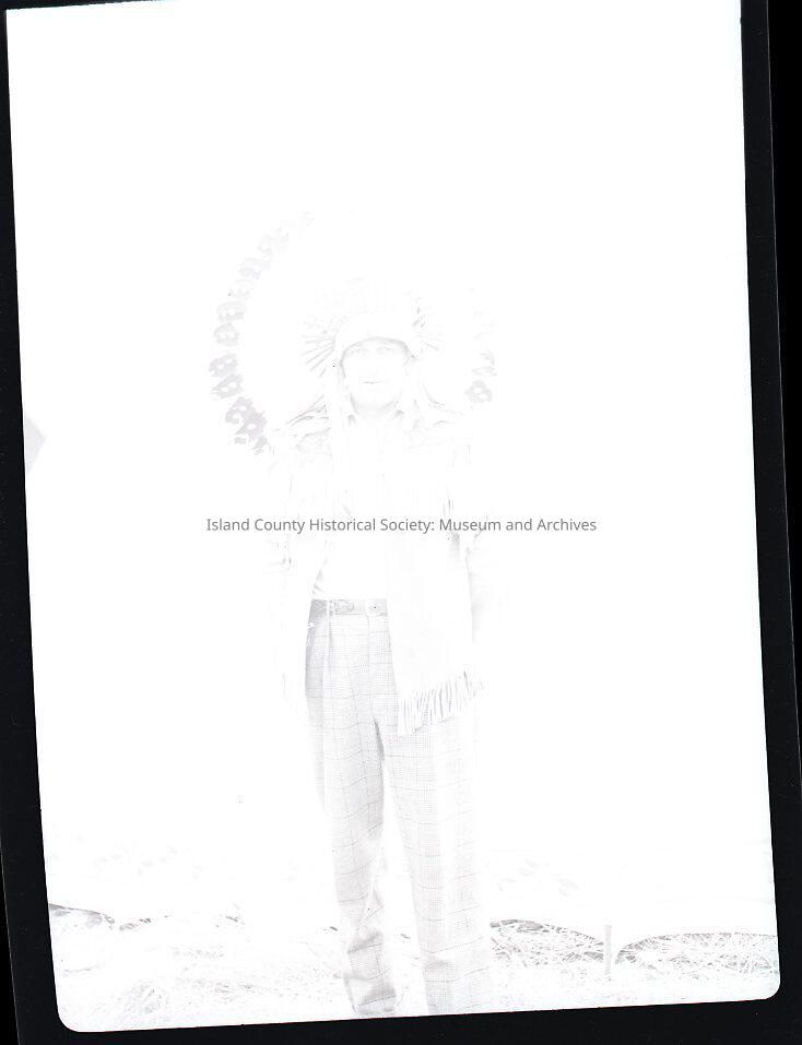 Native American Coupeville Water Festival. A Native American man or a man dressed up like one poses for the camera wearing a feather headdress, leather hide jacket with tassles and suit. A curtain is behind him.
