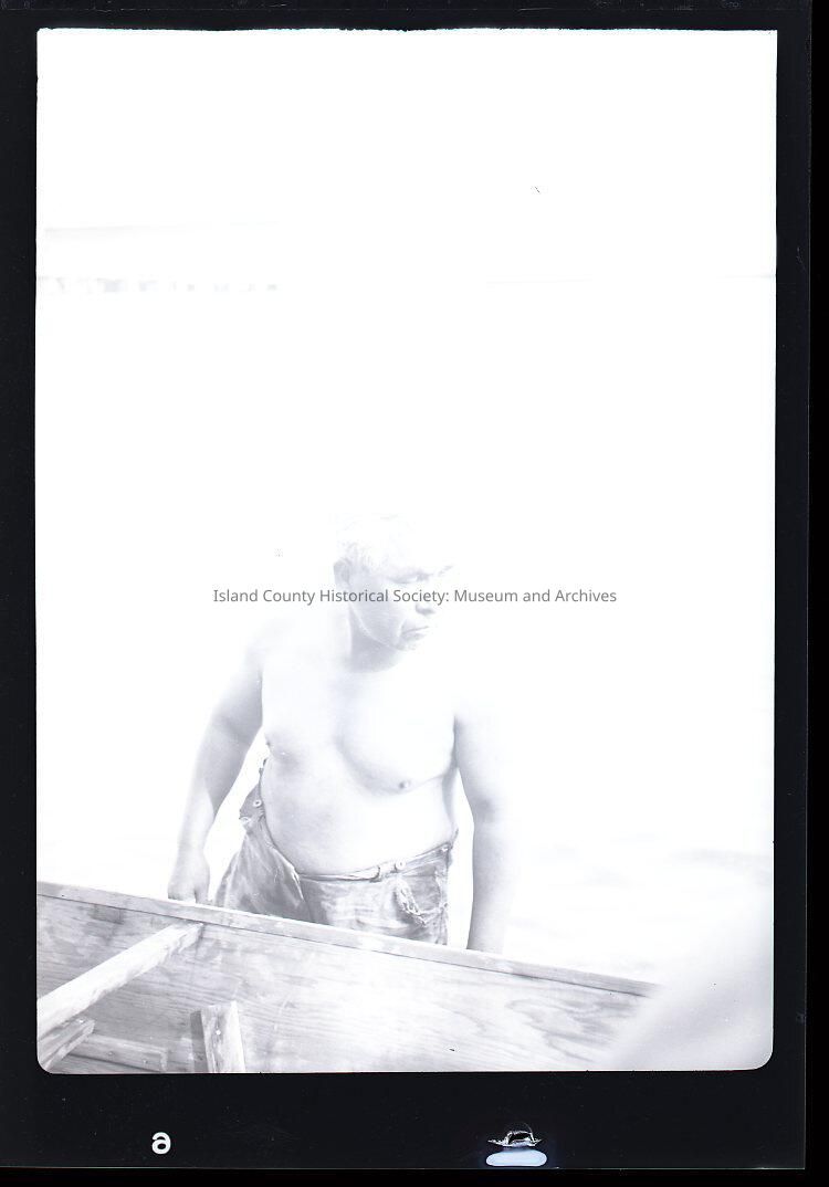 Native American Coupeville Water Festival. A large middle aged Native American man helps hold up part of a canoe. The wharf is in the background.