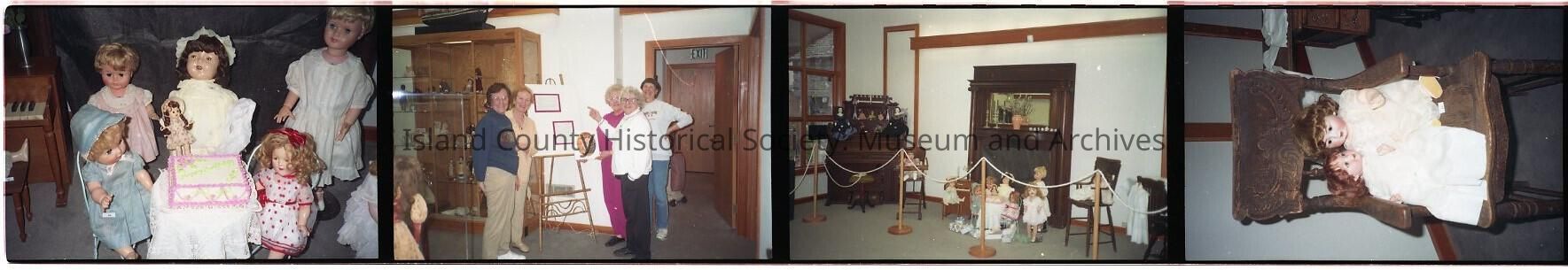 A strip of 4 color negatives of a doll exhibit. They are in chairs, on and in display cabinets and dressed in a variety of outfits. One of the frames has people - probably setting up the exhbit. Written on the envelope: museum work parties, yard, dolls, sea captains. 1993