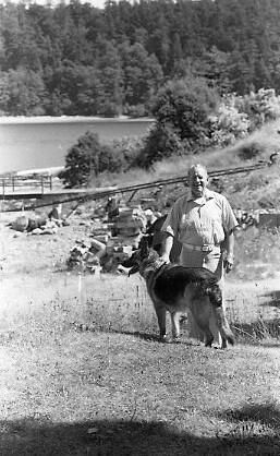 This black and white photo negative shows a man smiling, the man is wearing a white shirt that is tucked in, and his dog (German Shepard) standing next to him. Behind the man is a boardwalk.Made/Created