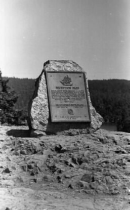 This black and white photo negative shows a rock that has a informational plaque about Deception Pass.Made/Created