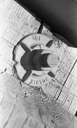 This black and white photo negative shows a close up of a bolt that appears to be on a ferry dock. the bolt has the name victor on it.Made/Created