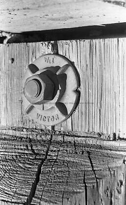 This black and white photo negative shows a close up of a bolt that appears to be on a ferry dock. the bolt has the name victor on it.Made/Created