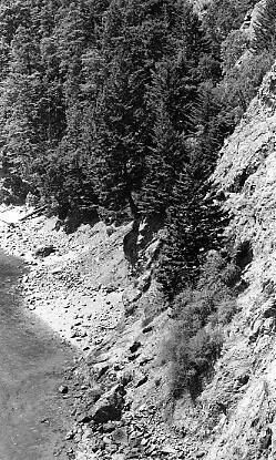 This black and white photo negative shows a hillside that slopes down and meets the water. Towards the end of the slope there is a lot of gravel and as the hill gets taller there are trees.Made/Created