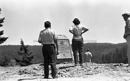 This black and white photo negative shows a group of people walking up on an island. There is a monumental rock that shows a informational plaque. In front of the group of people are trees.Made/Created