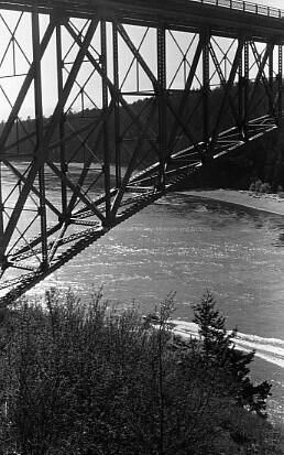 This black and white photo negative shows the underside of the Deception Pass bridge, the part of the bridge that was taken was one of the arches. Below the bridge are trees, and water. Beyond the water are more trees.Made/Created