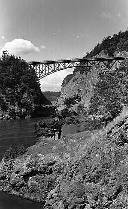 The black and white photo negative shows the Canoe Pass bridge span. The photo has various rocky slopes, and trees on top of the slopes. Beyond the bridge is a cluster of trees.Made/Created