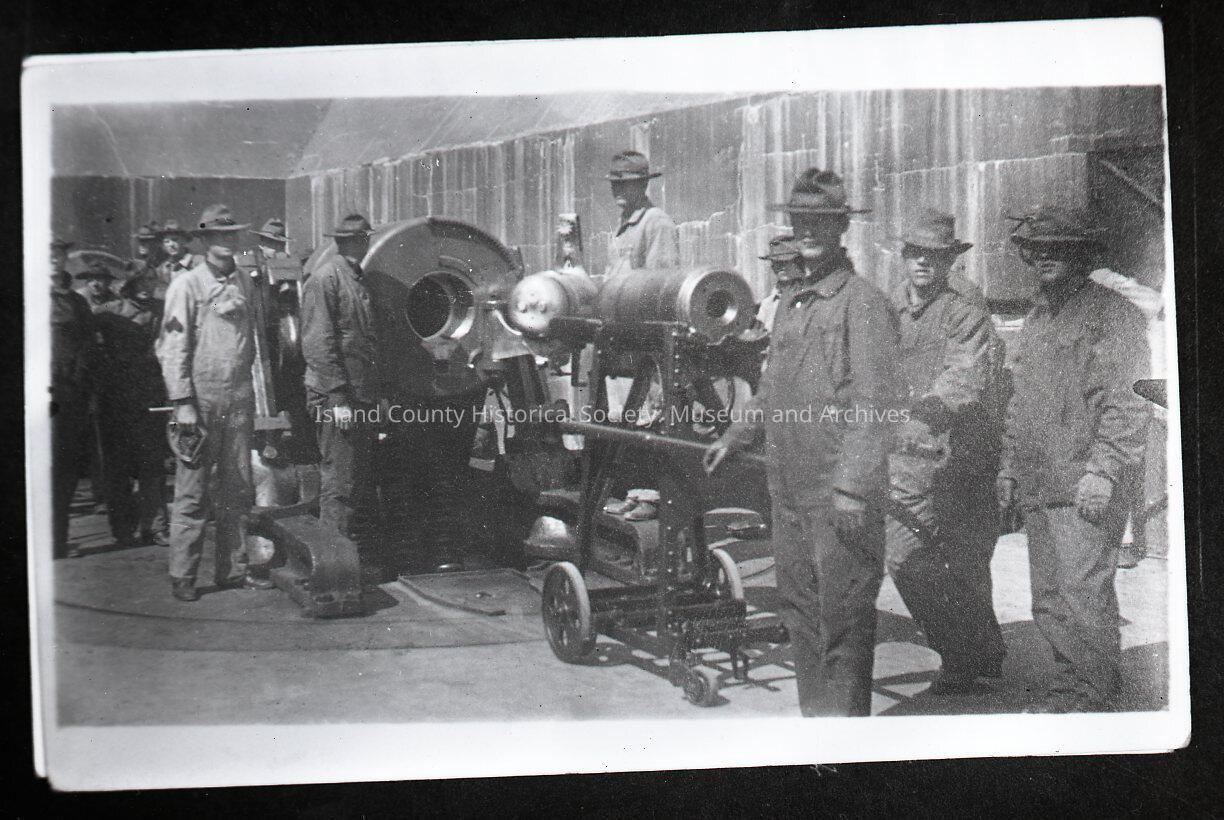 Negative of soldiers standing beside gun at Ft. Casey while it is being loaded. (Two negativevs and another, larger print).Made/Created