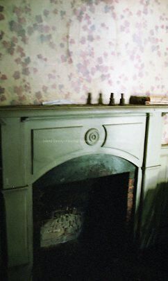 Ferry House Restoration. Interior shot. Fireplace - pale green/blue - against a wall-papered wall.Made/Created