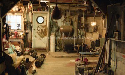 Interior view of a house. Lots of old objects probably in a garage - heater, tools, exercise items.Made/Created