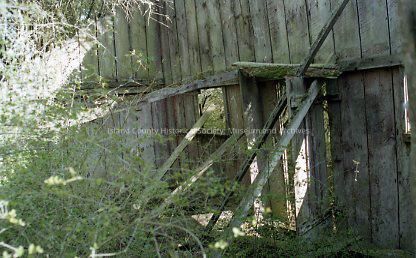 Another side of the old building - braces to support the wall. Entryway or porch and door.Made/Created