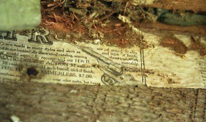 Looks like old ad from newspaper stuck on lumber on the wall. Leaves.Made/Created