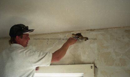 Interior of a house under repair - man applying plaster on a wall near a ceiling.Made/Created