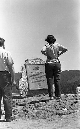 This black and white photo negative shows two people standing around a monumental rock. On the monumental rock has an informational plaque about Deception pass. In front of the people are trees.Made/Created