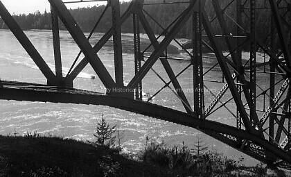 This black and white photo negative shows the underside of the deception pass bridge. In one of the openings of the bridge there is a bridge appeared there that is passing by. Below the bridge is a hill covered by trees.Made/Created