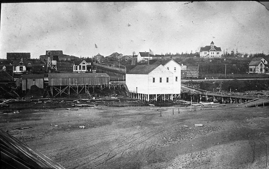Oak Harbor from the waterfront circa 1905 seen in the photo are the Maylor store, the wave house and the hitching shed.Made/Created