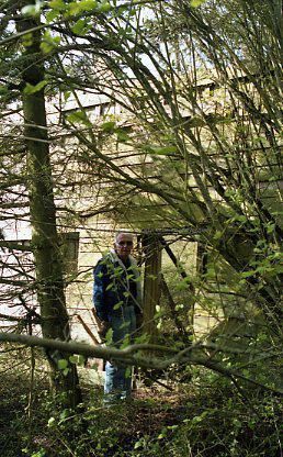 Roger Sherman standing beside the wall of the old building - in the surrounding trees.Made/Created