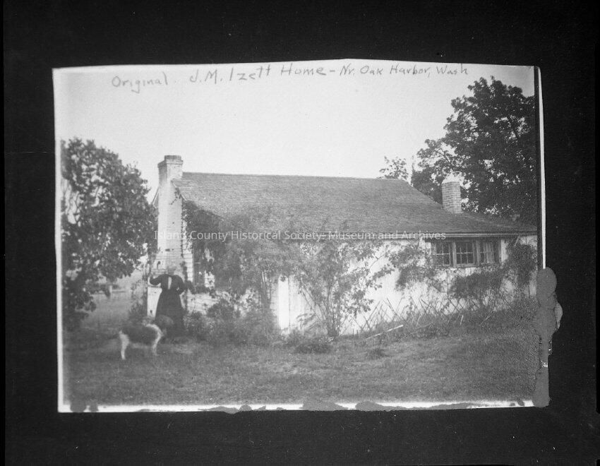 J.M. Izett home near Oak Harbor. A woman is staanding outside with an animal possibly a dog or a sheep.