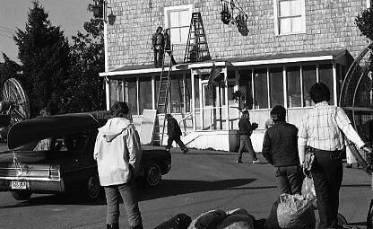 Filming of "War of the Roses" crew are working on the facade of a building while many workers are walking around on the street. A car is parked in front with a canoe tied to the top.