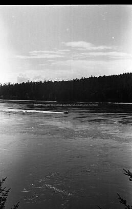 This black and white photo negative shows a boat passing by the deception pass bridge. Beyond the bridge shows trees, and the photo was taken from behind a tree.Made/Created