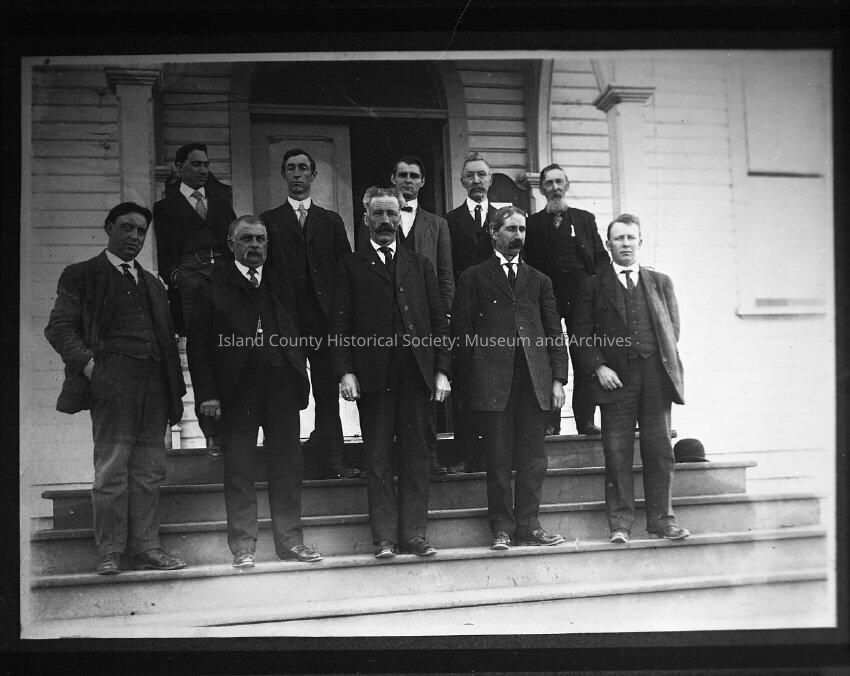 Group photo of Island County Court House Commissioners, standing on the court house steps in Coupeville. Ten men, two rows of five.