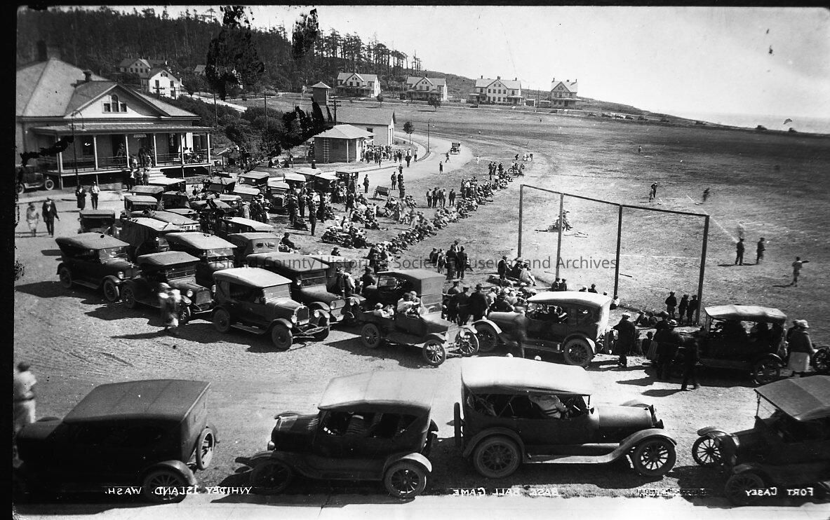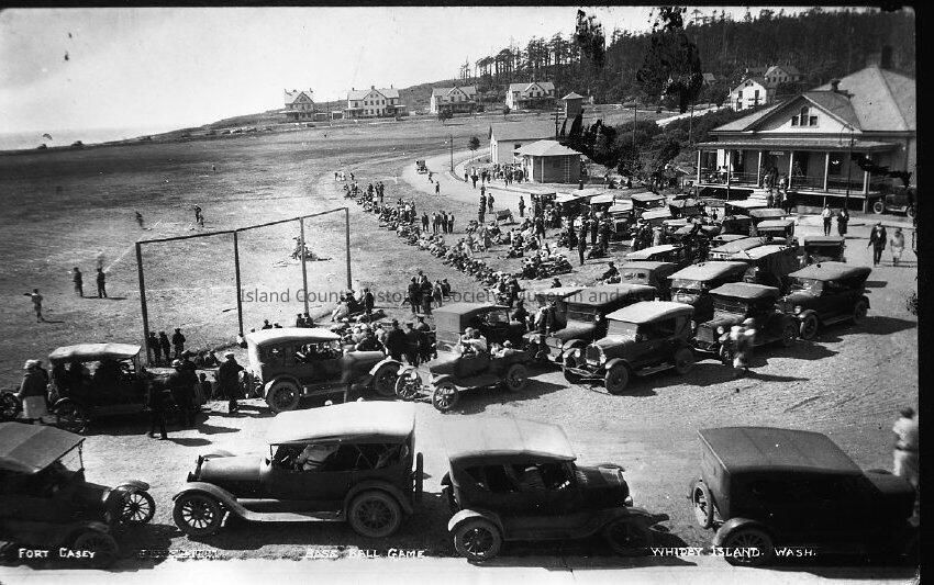 Fort Casey baseball game c.1920's. Visible in the photo are many cars and part of the baseball feild.Made/Created