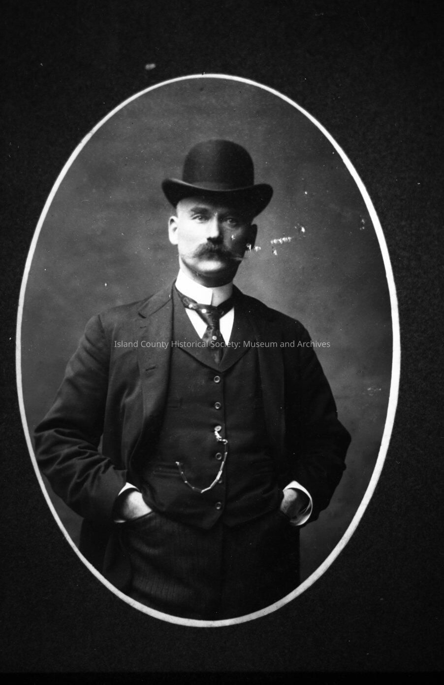 Portrait of LP Byrne and Oak Harbor entrepreneur. He is wearing a hat and suit.Made/Created