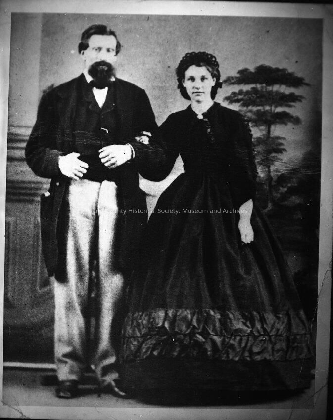 Portrait of Christine McCrohan Barrington and Captain Edward Barrington. Edward is wearing a longtailed suit and Christine is wearing a a large dark dress.