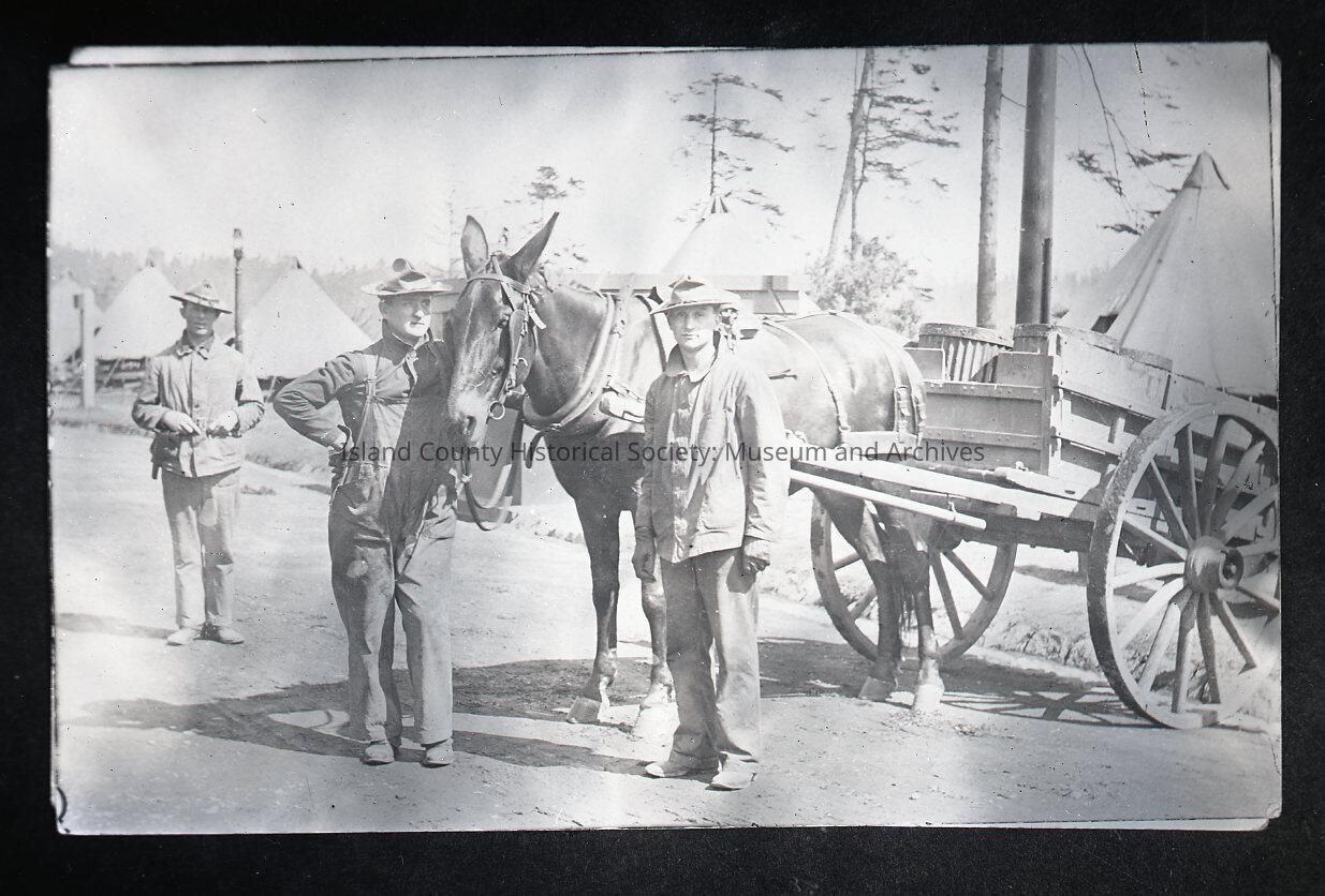 Men in uniform standing beside horse and wagon. Looks like garbage bins in the wagon.Made/Created