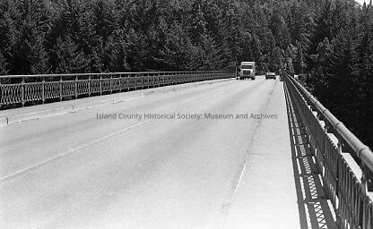 This black and white photo negative shows the deception pass bridge that is almost empty except for two vehicles in the background. The vehicles are next to each other passing by, the oncoming vehicle is a truck. Behind the two vehicles are trees.Made/Created