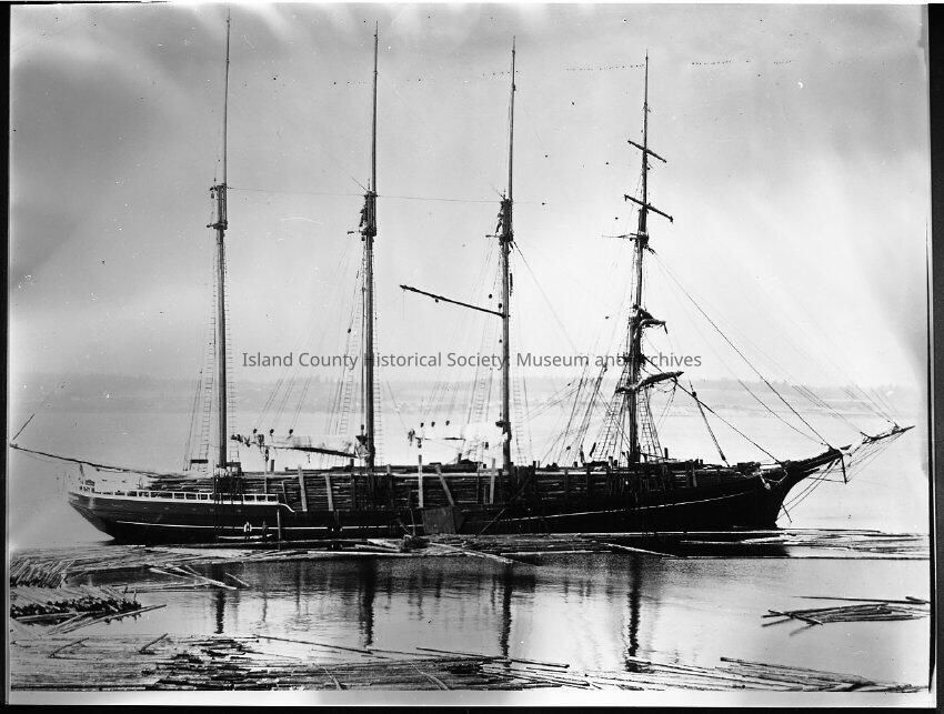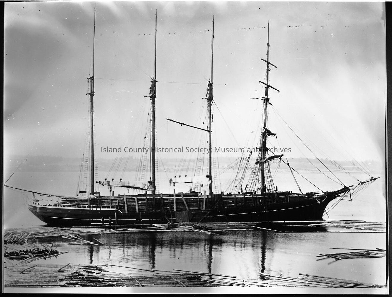 A four masted ship upon which logs are being loaded. There are a number of rafts of logs floating in the water in the foreground. Two men can be seen standing on a dock near the stern of the boat. The boat takes up the majority of the frame of the photo.Made/Created