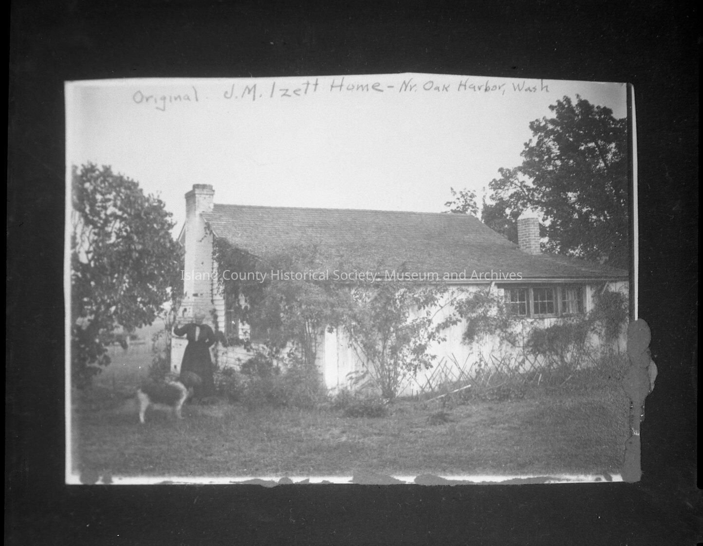 J.M. Izett house, near Oak Harbor. A woman is standing outside the house with what looks like either a dog or a sheep.Made/Created