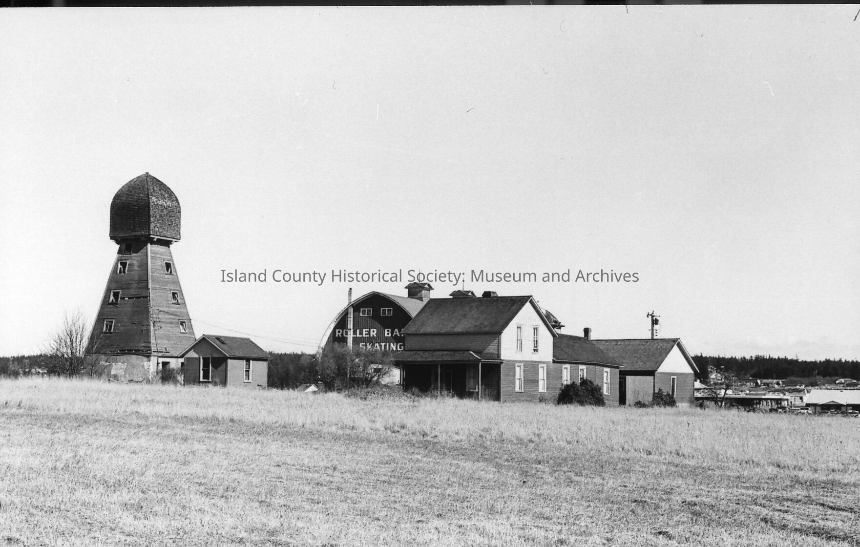 Neil farm buildings in Oak Harbor. House, water tower, and shed in front. Behind stands barn with Roller Barn and Skating printed on end.Photograph Details