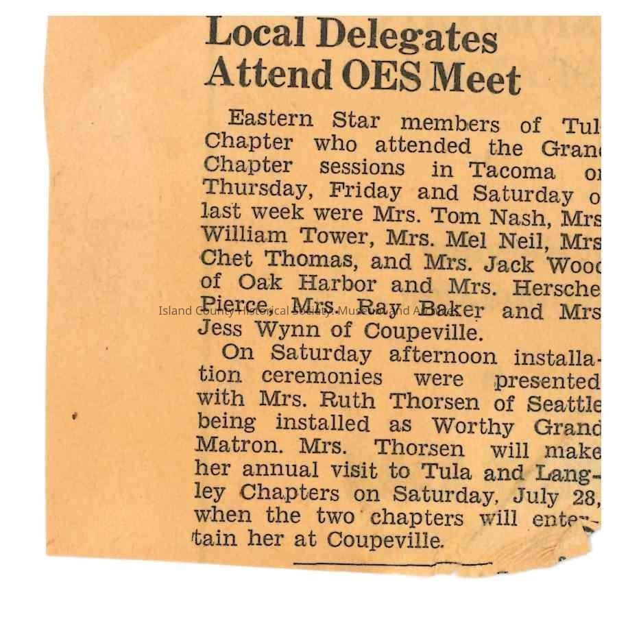 Order of the Eastern Star members meet to attend Grand Chapter meetings in Tacoma, WA. Installation ceremonies were held, with Mrs. Ruth Thorsen of Seattle installed as Worthy Grand Matron. Mrs. Thorsen will then travel to visit the Tula and Langlet chapters in July 28th.