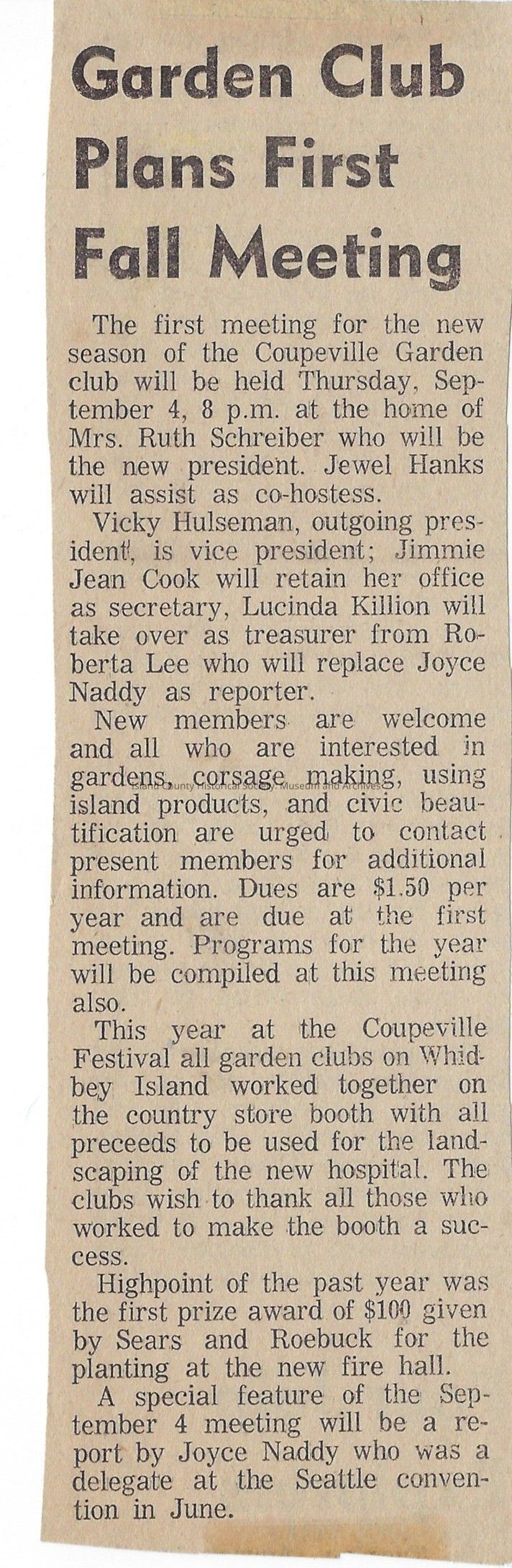 Coupeville Garden club holds first fall meeting of the year with Mrs. Ruth Schreiber as the new president and host of the club. Jewel Hanks will be the co-hostess. The article informs of leadership positions in the club, what the club entails, and successes from the past year. Dated September 4, year unknown.