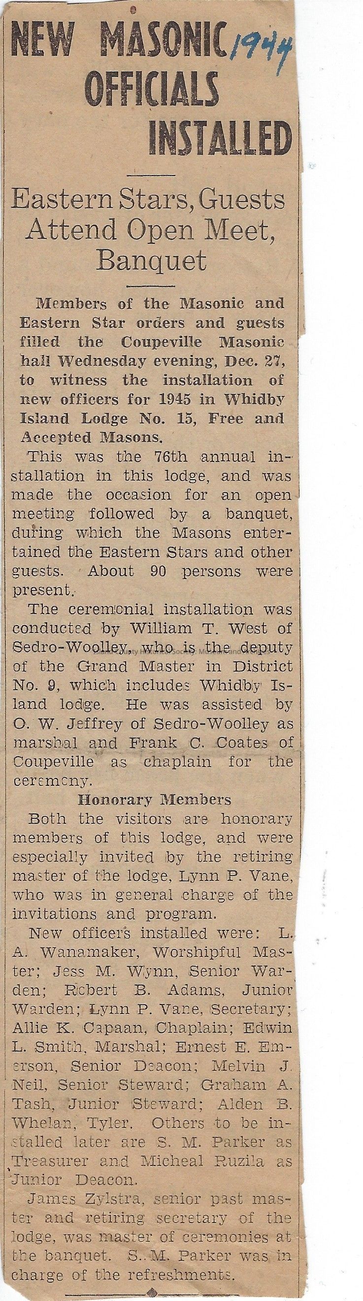 Members of the Masonic and Eastern Star orders attend the installation of new officers for Whidbey Island Lodge No. 15, Free and Accepted Masons. This was the 76th annual installation in the Coupeville lodge and the ceremony was conducted by William T. West (deputy of the Grand Master in District 9) of Sedro-Woolley.Date(s) of Creation