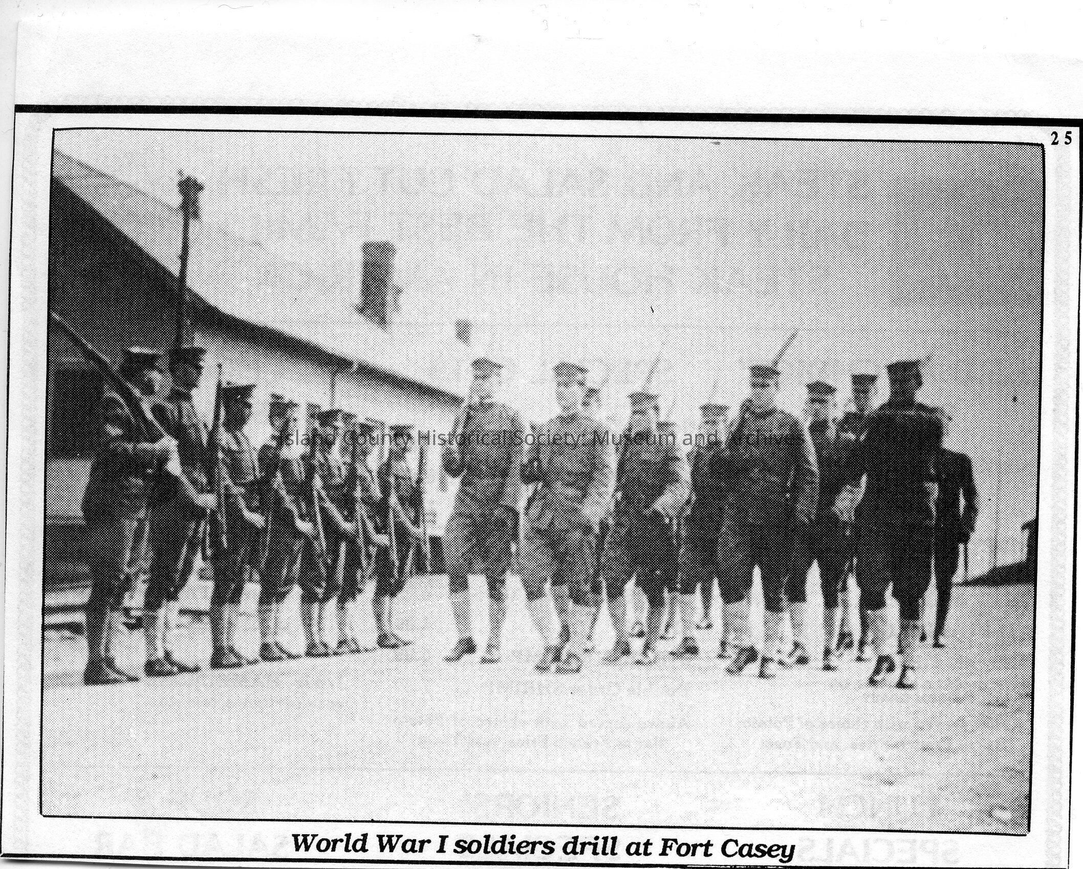 Black and white newspaper photograph of World War I soldiers at Fort Casey.