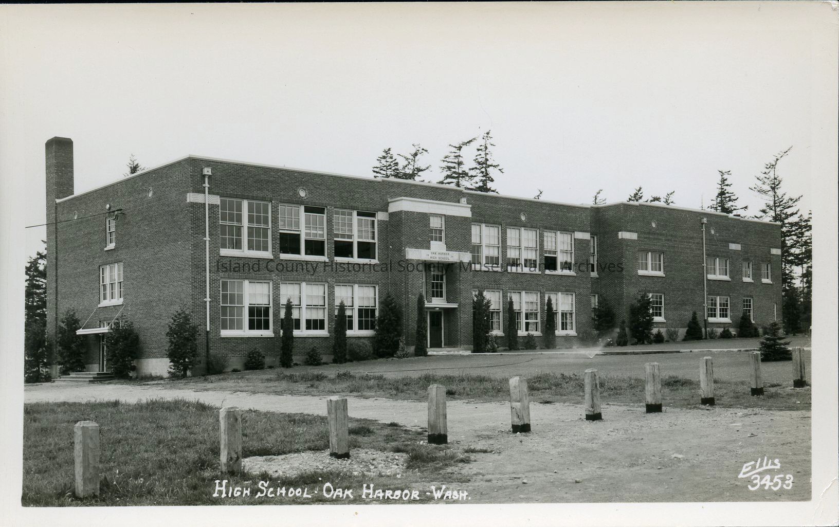 Postcard depicting Oak Harbor High School, possibly 1940s-1960s. Photo by Ellis.