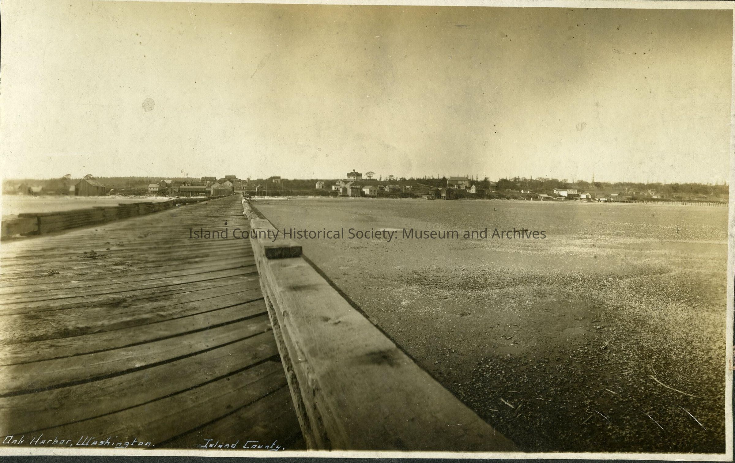 Oak Harbor from the end of the dock about 1918. Gertie Parker. The waterfront and the town of Oak Harbor can be seen.