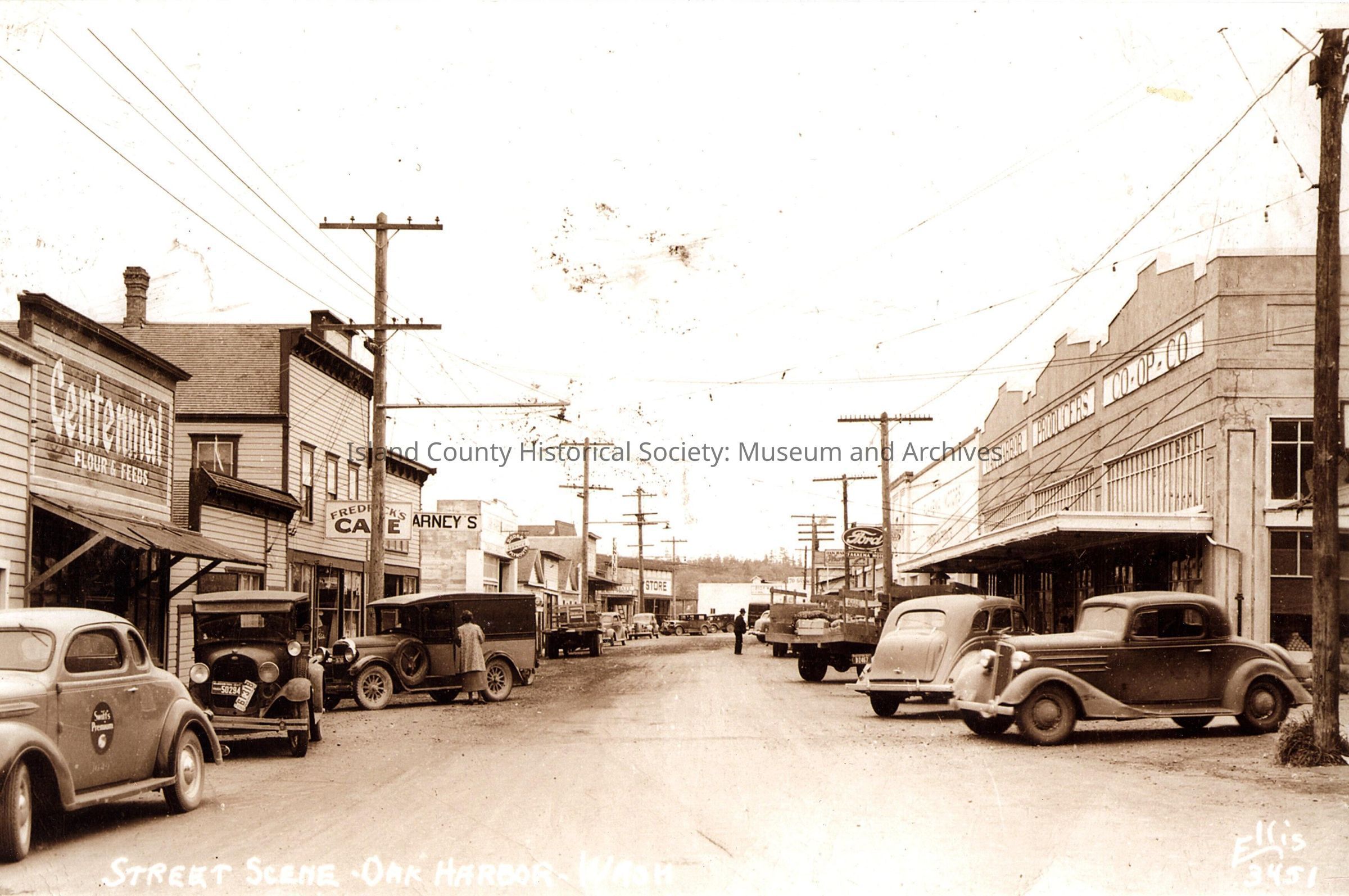 Photo of Oak Harbor street scene. Date Unknown (early 1900s to 1940s). Landscape. Telegraph poles along both sides of street, as well as shops and cars. Shops include but not limited to: Frederick's Cafe, Centennial Flour & Feeds, Fakkema Hotel (Motel), arney's (first letter difficult to discern), Oak Harbor Producers Co-op Co., Ford (Motors), and a dentist. In the right bottom corner is written: "Ellis 3451"Photograph Details