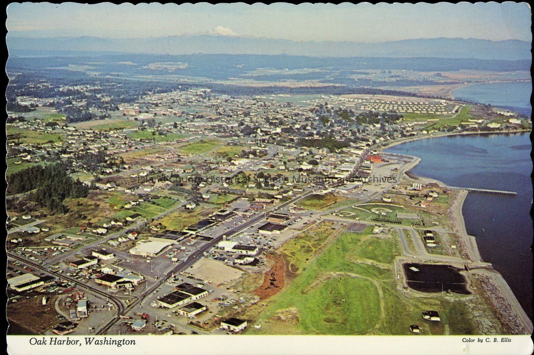 Postcard depicting an aerial view of Oak Harbor with Mount Baker in the background. Possibly c. 1960s.