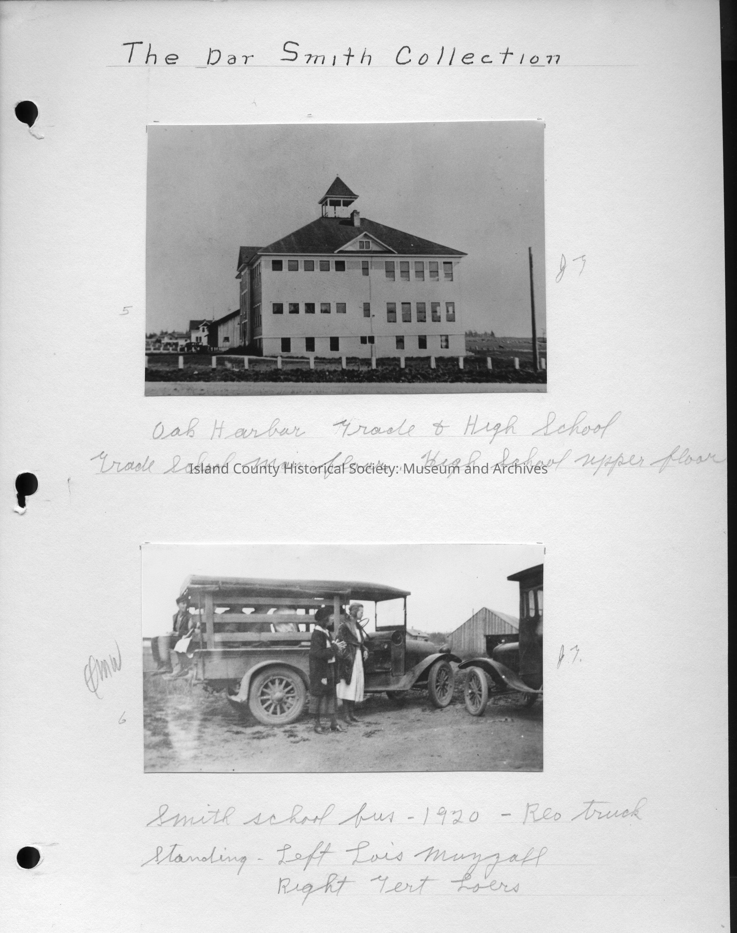 Bottom Photo - 4.5"W x 2.5"H - Photo of the Smith school bus, which was a Reo truck. 1920. Two teenage girls are standing in front of the bus. Left - Lois Muzzall; Right - Gert Loers