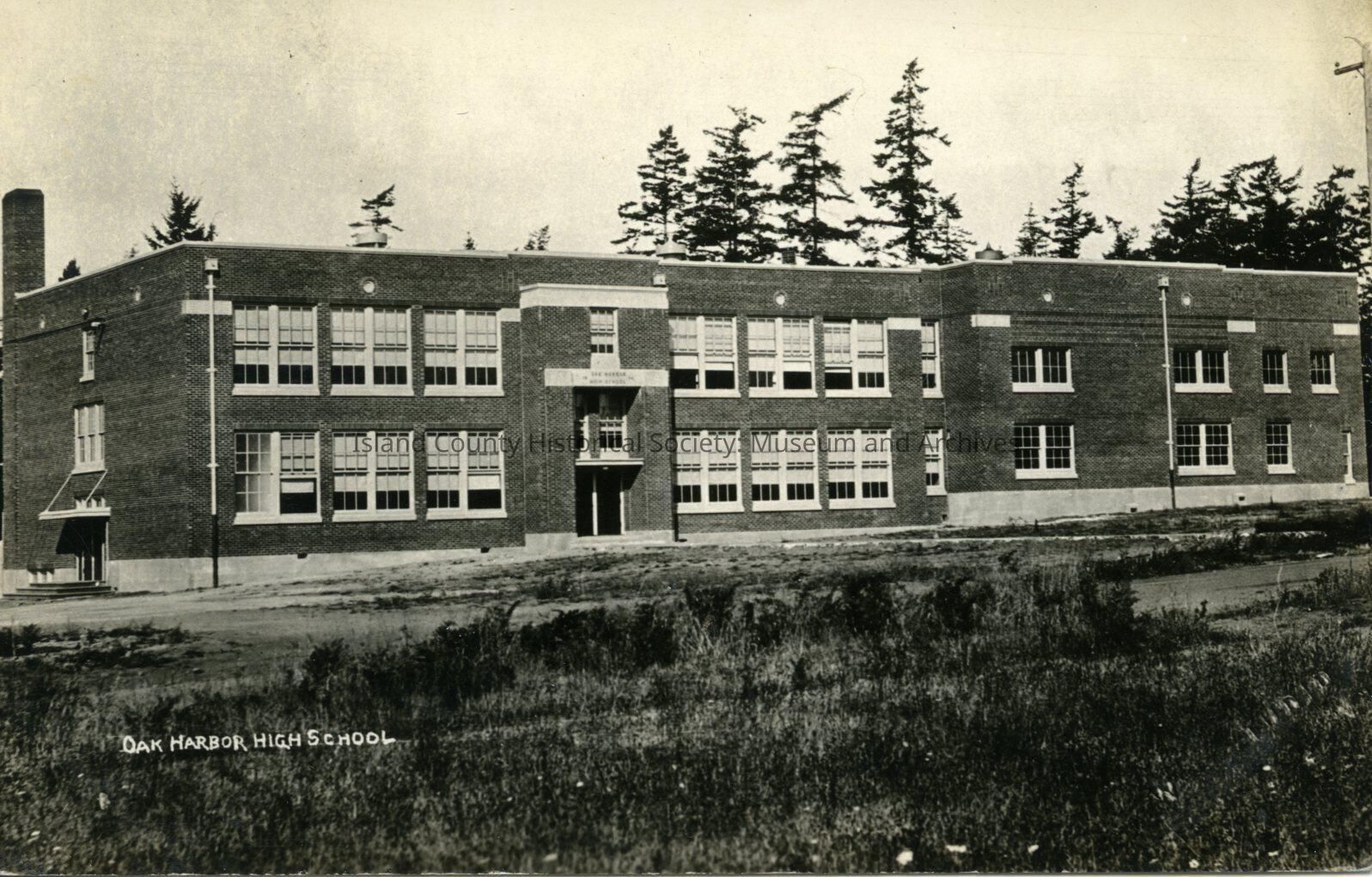 A photo of the Oak Harbor High School. Its a two story brick school building with large windows on the front. The side of the building can be seen on the left, making it clear its longer than it is wide. There is no land scaping and tall fir trees can be seen in the backgorundMade/Created