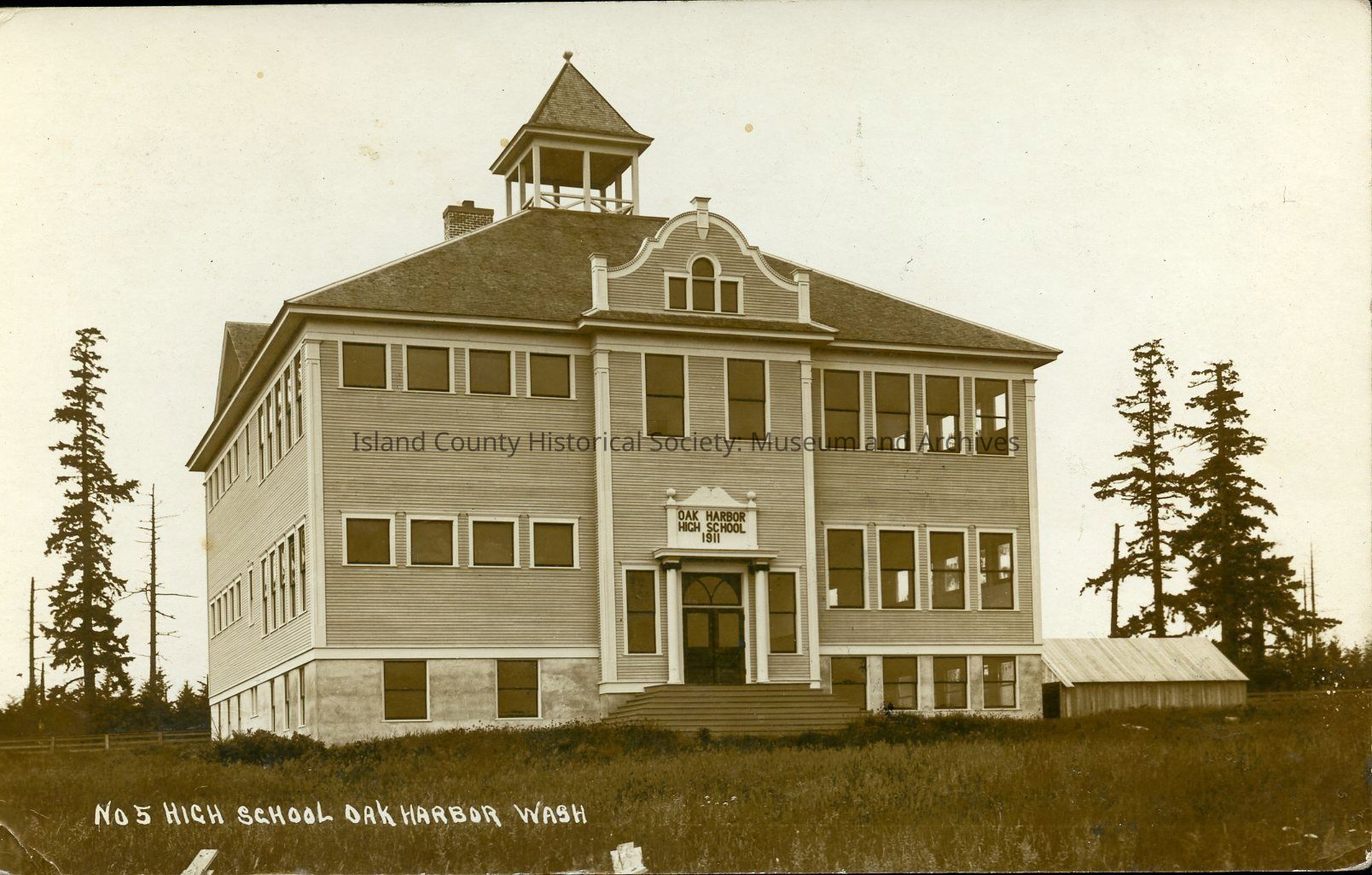 Postcard depicting Oak Harbor High School, c. 1911 (postmark date is illegible). Handwritten note from Roger Sherman on the reverse says, "This is the school on Midway across from brick school."