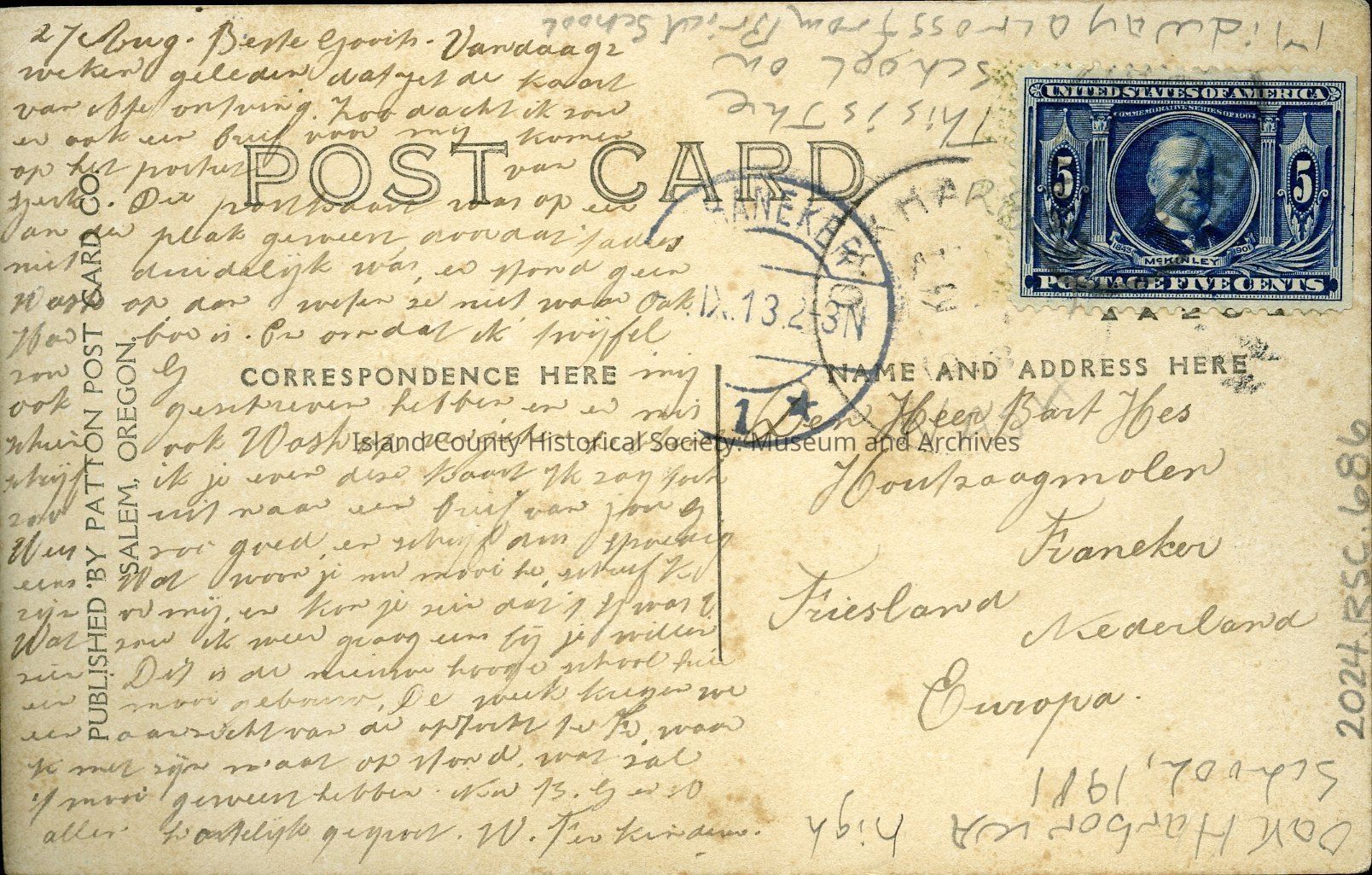 Postcard addressed to Den Heer Bart Hes, Houlzaagmolen [or Houtzaagmolen], Franeker, Frieslana, Nederland, Europe.