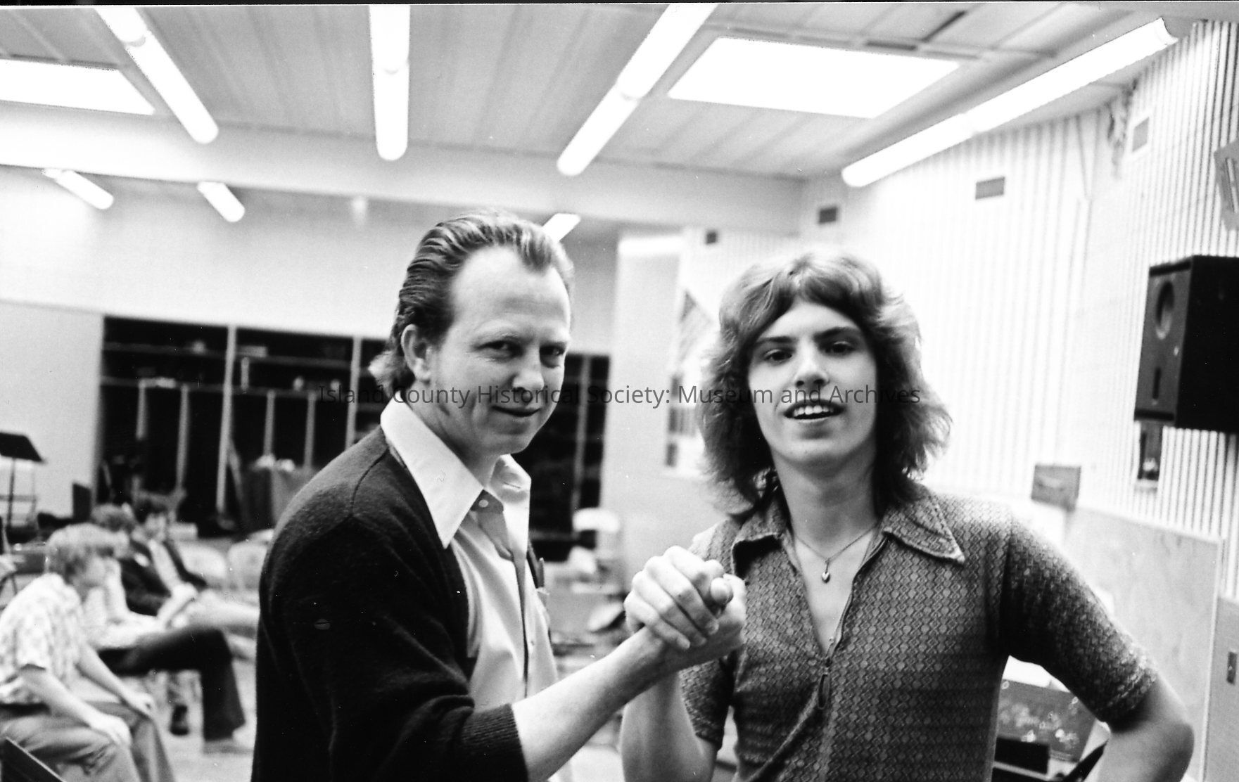 A teacher and a student grasp hands in the band room. Other students are seated in the background..Photograph Details