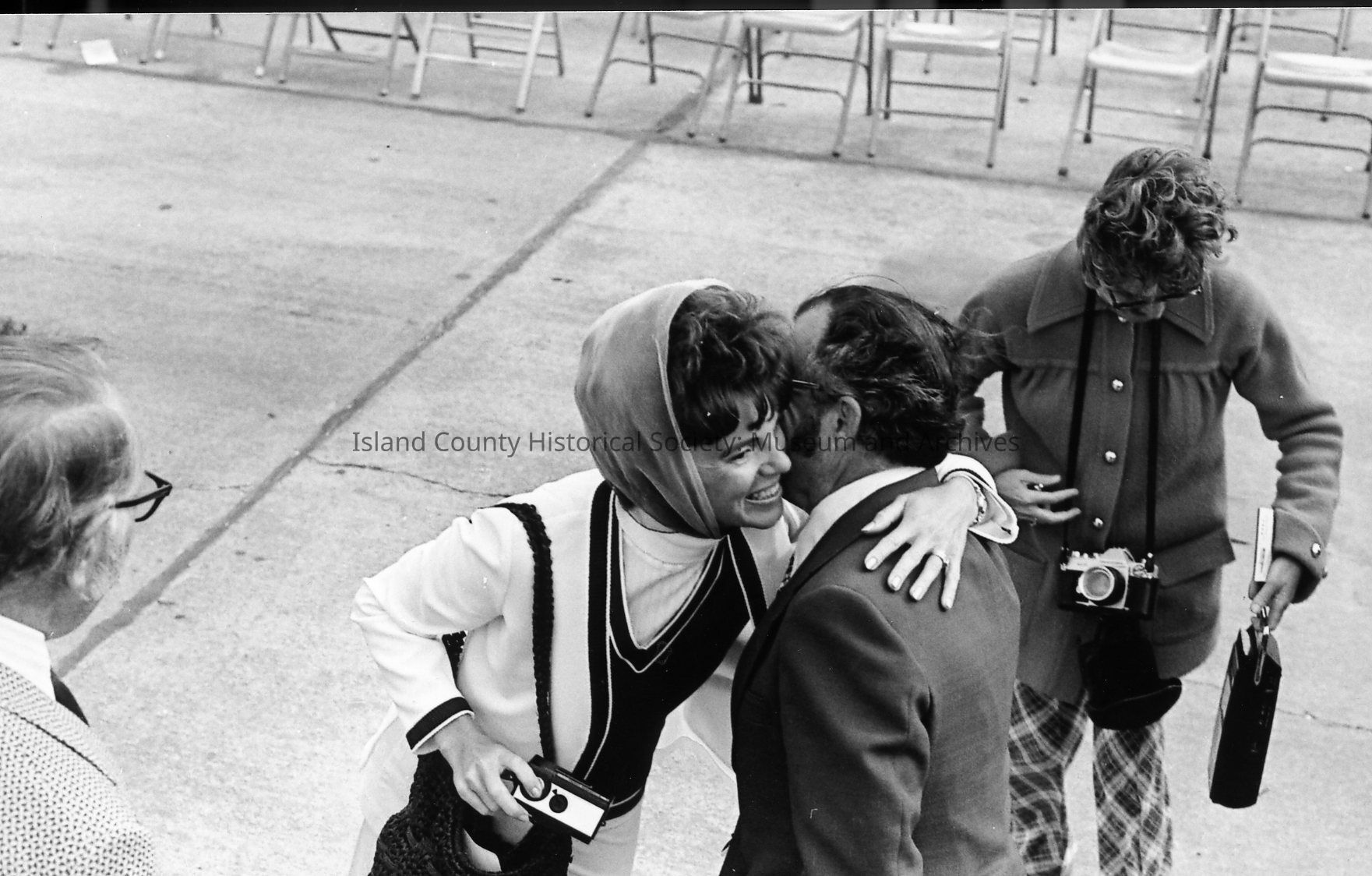 Woman with camera and bouffant hairdo embraces Congressman Lloyd Meeds at opening of Oak Harbor Marina. A woman in background holds tape recorder and has 35mm camera hanging around her neck. A man looks on. Empty folding chairs in the background.Photograph Details